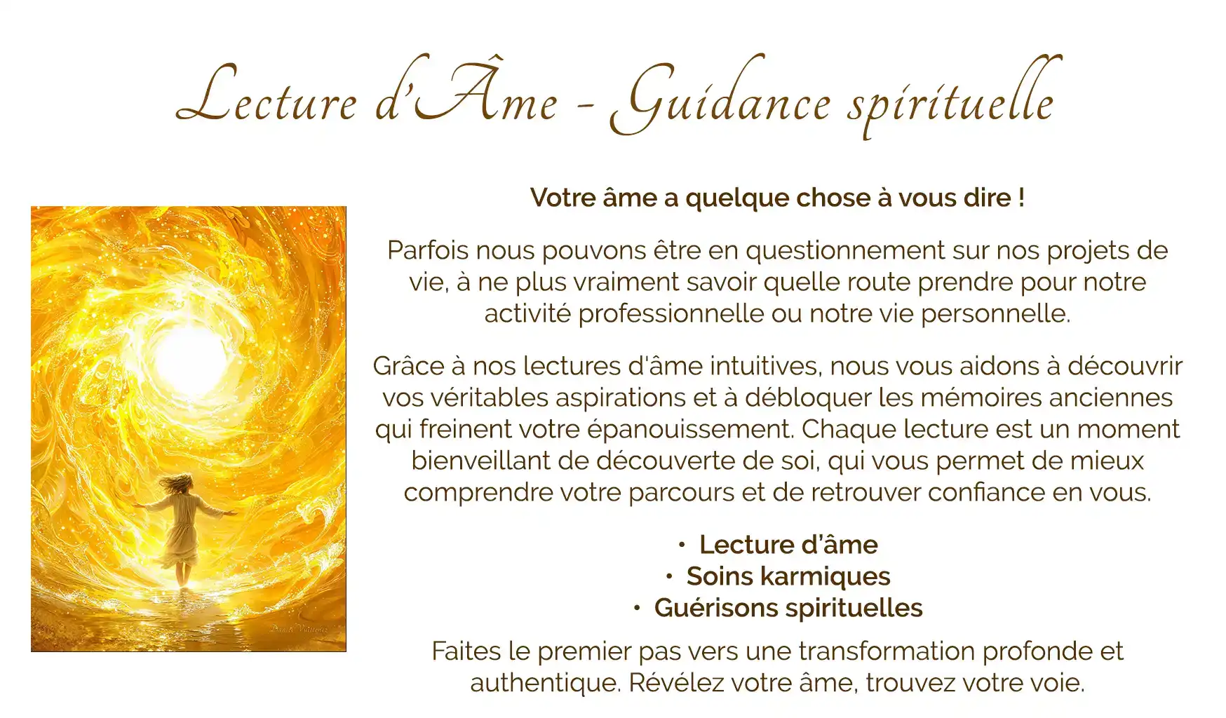 Lectures d’Âme Guidances Spirituelles Séance : 1h15 par Clarisse & Daniel Vuittenez à distance – tarif : 100€ 80€ Voir les disponibilités / Réserver Si vous avez réservé votre séance de Lecture d’âme,merci de cliquer ci dessous pour régler votre séance : Promo ! Lecture d’Âme – Guidance spirituelle €100.00 Le prix initial était : €100.00.€80.00Le prix actuel est : €80.00. Commentaires Soyez le premier à laisser votre avis sur “Lecture d’Âme – Guidance spirituelle” Annuler la réponseVotre adresse e-mail ne sera pas publiée. Les champs obligatoires sont indiqués avec *Votre note Taux… Parfait Bien Moyenne Pas si mal Très pauvre Votre avis *Nom * E-mail * Enregistrer mon nom, mon e-mail et mon site dans le navigateur pour mon prochain commentaire. Envoi Δ